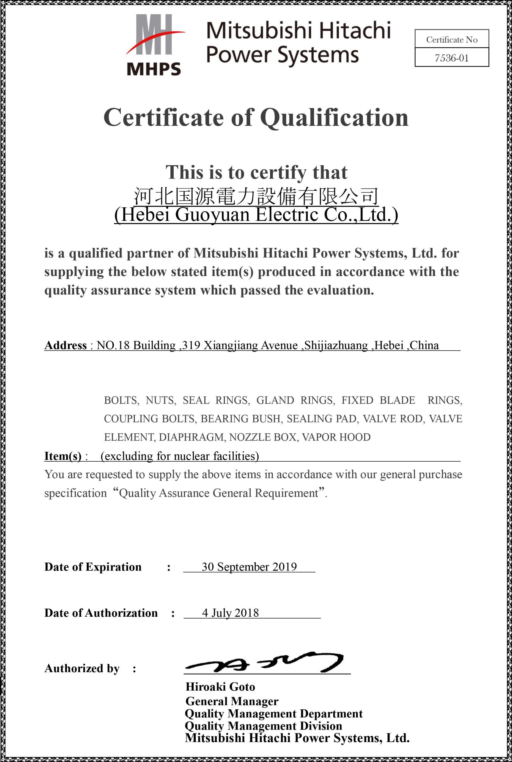 三菱日立電力系統(tǒng)合格供方證書